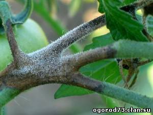 На листьях и стеблях помидор выступают темно-коричневые пятна, во влажную погоду на нижней стороне Листа или на пораженном стебле можно заметить нежный беловатый налет.